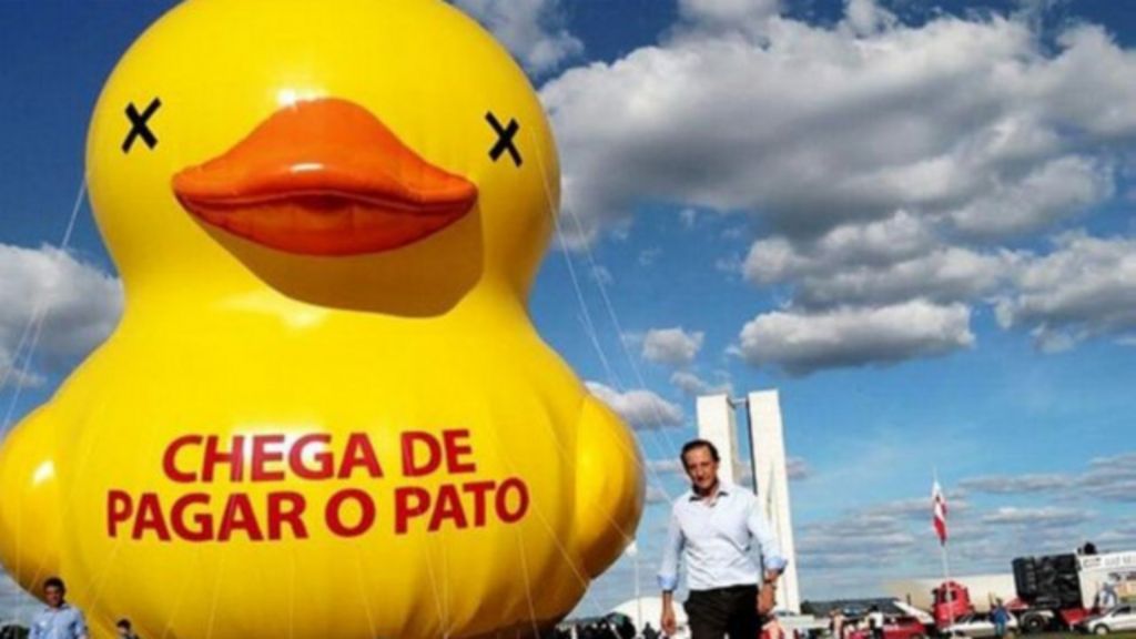 وكانت جماعات معارضة للرئيسة البرازيلية، ديلما روسيف، قد استخدمت بطة عملاقة من المطاط كدمى تمثيلية أثناء تظاهرات.