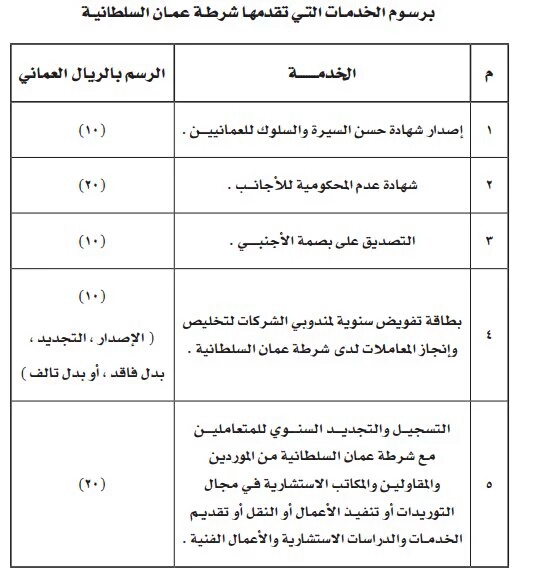 شرطة عمان السلطانية تصدر قرارا بتحديد رسوم لبعض خدماتها كما موضح في الصورة