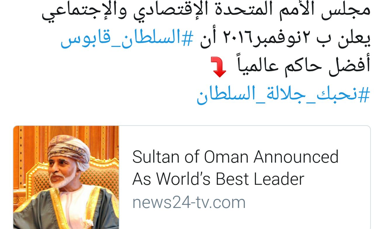 2 3 نوفمبر 2016، 21:28 للأسف الصورة ما ظهرت بس أتوقع تقصدي هذا الخبر : مجلس الأمم المتحدة الإقتصادي والإجتماعي يختار #السلطان_قابوس أفضل حاكم في العالم IMG-20161103-WA0013.jpg نسأل الله أن يمده بالصحة والعافية وأن يحفظه لنا من كل مكروه وسوء ويحفظ جميع قادة دول الخليج