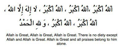 ٠•••*~الله أكبر الله أكبر الله أكبر , لا إله إلا الله , الله أكبر الله أكبر ولله الحمد , الله أكبر كبيرا , والحمد لله كثيرا , وسبحان الله بكرة وأصيلا , لا إله إلا الله وحده , صدق وعده , ونصر عبده , وأعز جنده , وهزم الأحزاب وحده , لا إله إلا الله , ولا نعبد إلا إياه , مخلصين له الدين ولو كره الكافرون .